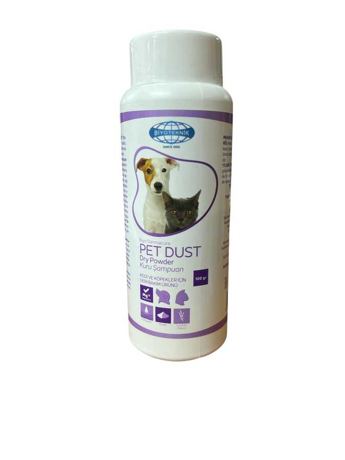 Kullanım Sahası: BiyoDermacure PET-DUST DryPowder; Kedi ve köpeklerin temizliğinde kullanılmak üzere hazırlanmış bir kuru şampuandır. Sıklıkla yıkanması gereken kedi ve köpeklerin ciltlerindeki yağ dengesinde bozulmalar meydana gelmektedir. Bu gibi durumlar ile birlikte su ile yıkanmaktan hoşlanmayan kedi ve köpeklerin; derilerinin temizlenmesini ve kötü kokuların giderilmesi ile hoş bir kokuya sahip olmalarını sağlar.